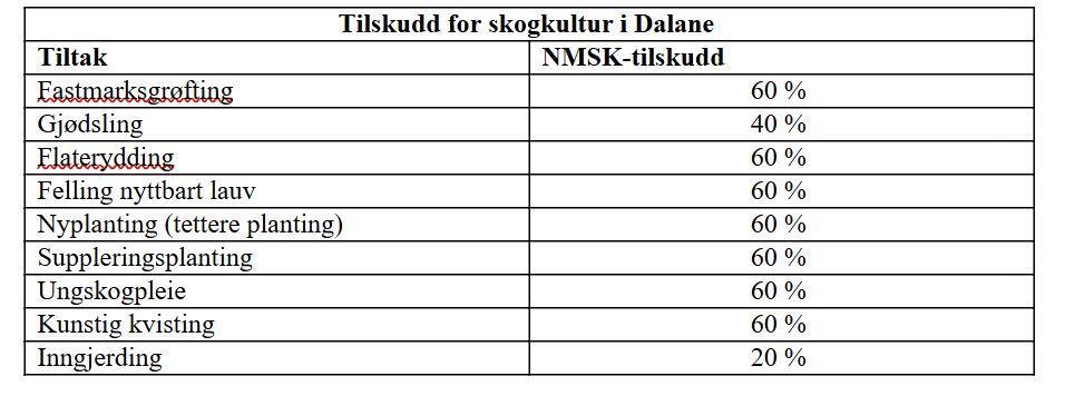 Tilskuddssatsene er fastsatt på grunnlag av føringene i NMSK-strategien. Tilskuddsbudsjettet er basert på ventet aktivitet og tildelingen fra Statsforvalteren. Tildeling av tilskudd til skogkultur baseres på førstemann til mølla prinsippet frem til budsjettet er brukt opp.